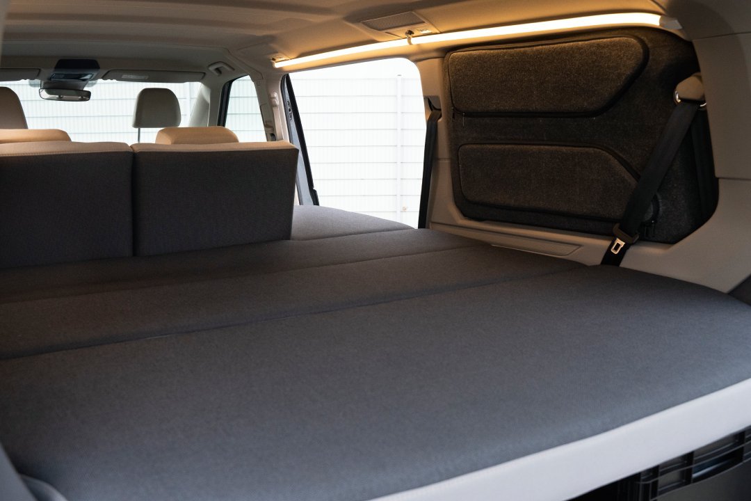 Rücksitzbank für drei Personen, durchladefähig und leicht herausnehmbar; 2x ISOFIX an den äußeren Sitzpositionen; Bettentsteht durch schnelles Umlegen der Rücksitzlehne, 2m Liegelänge, 1,33m Breite; Bezüge abziehbar und waschbar; Kofferraum von innen zugänglich